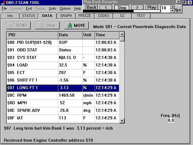 OBD-2 Automotive Scan Tool Browser Real Time Data Grid Screen Shot